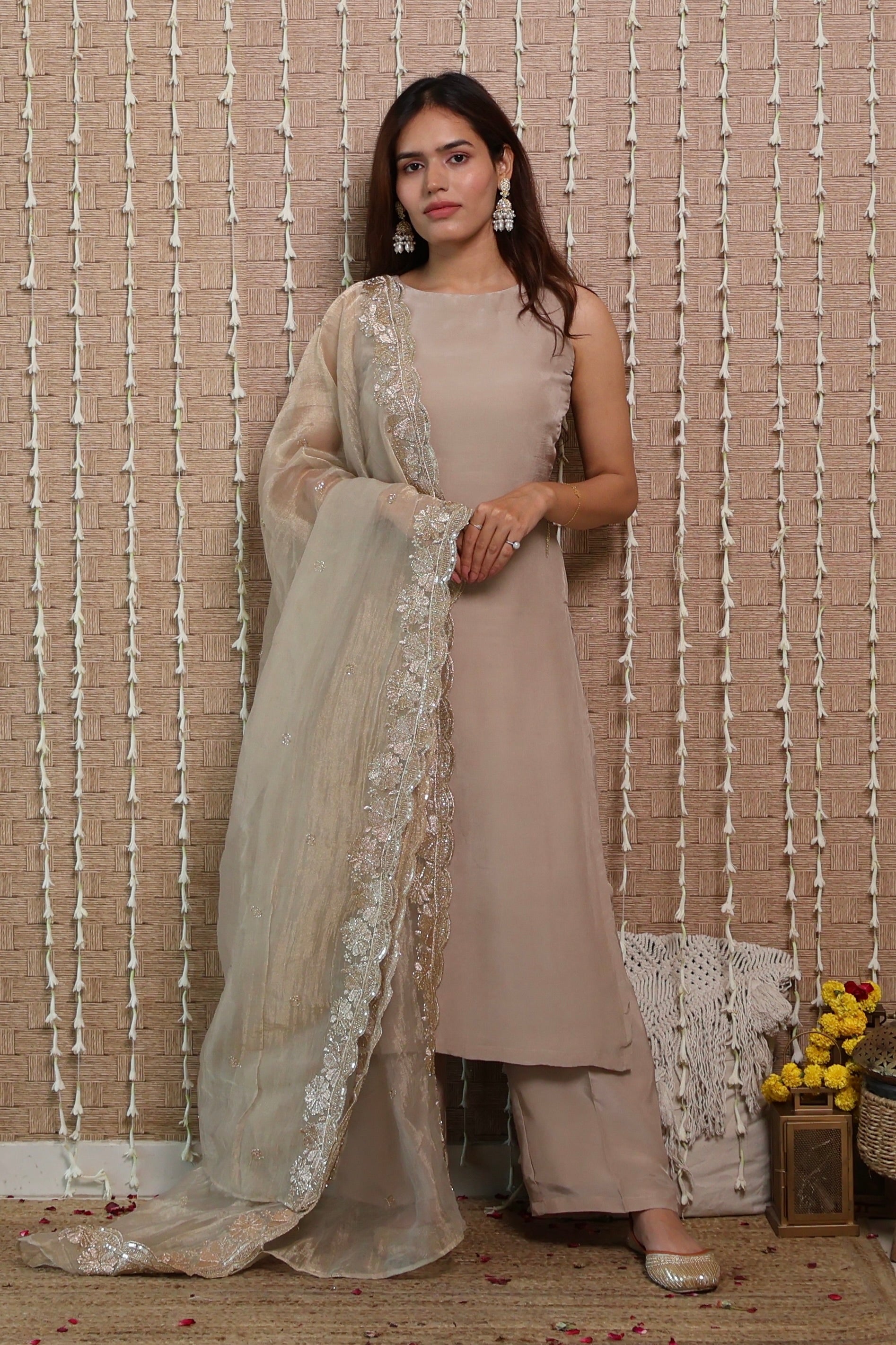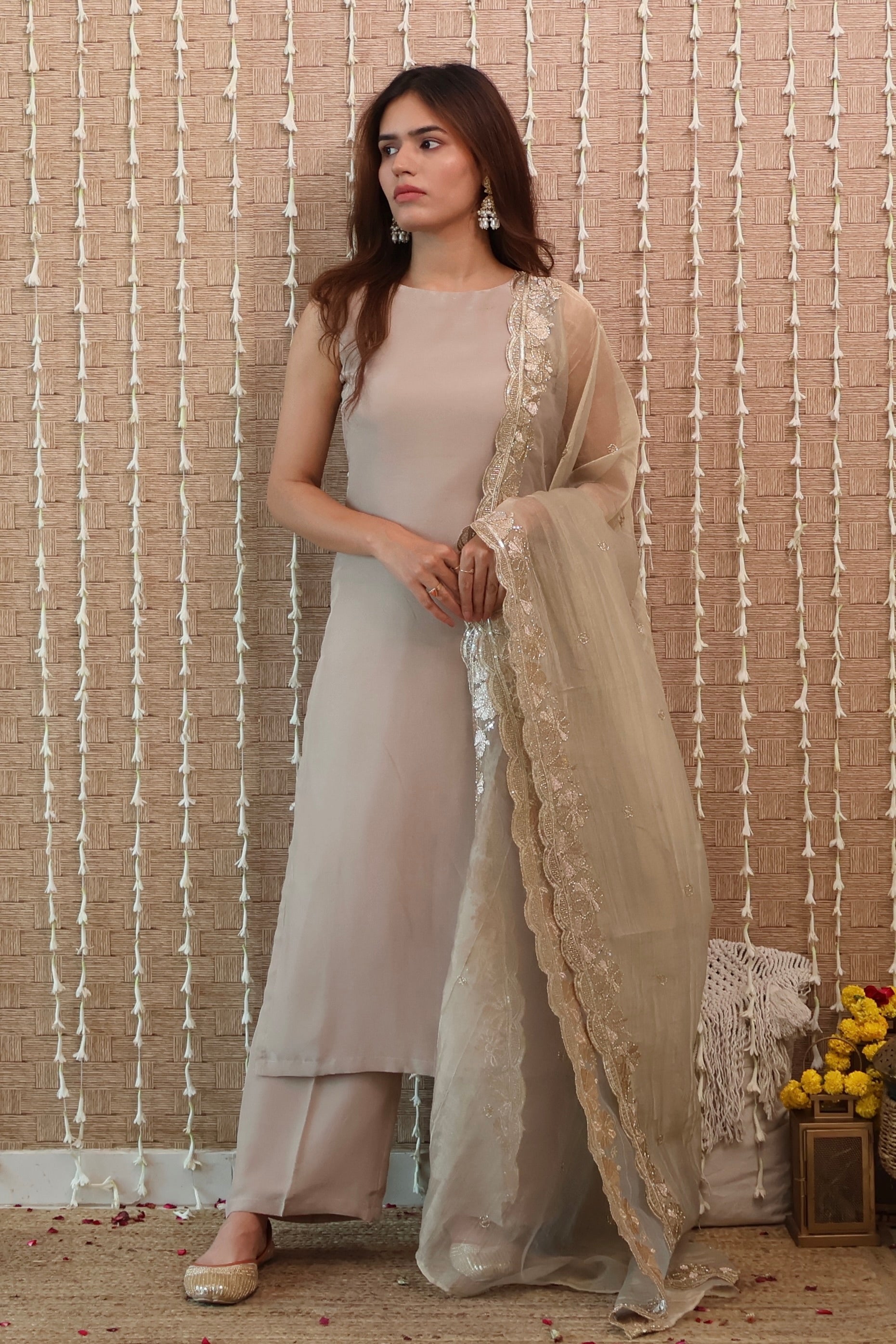 Dusty Grey Pure Crepe Kurta Set with Embroidered Tissue Dupatta
