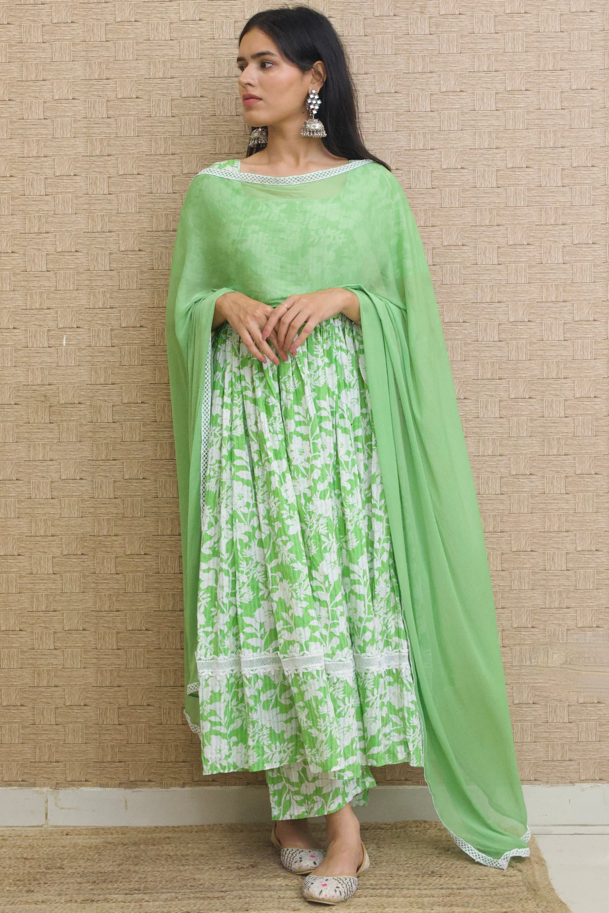 Frog Green Kantha Cotton Anarkali set