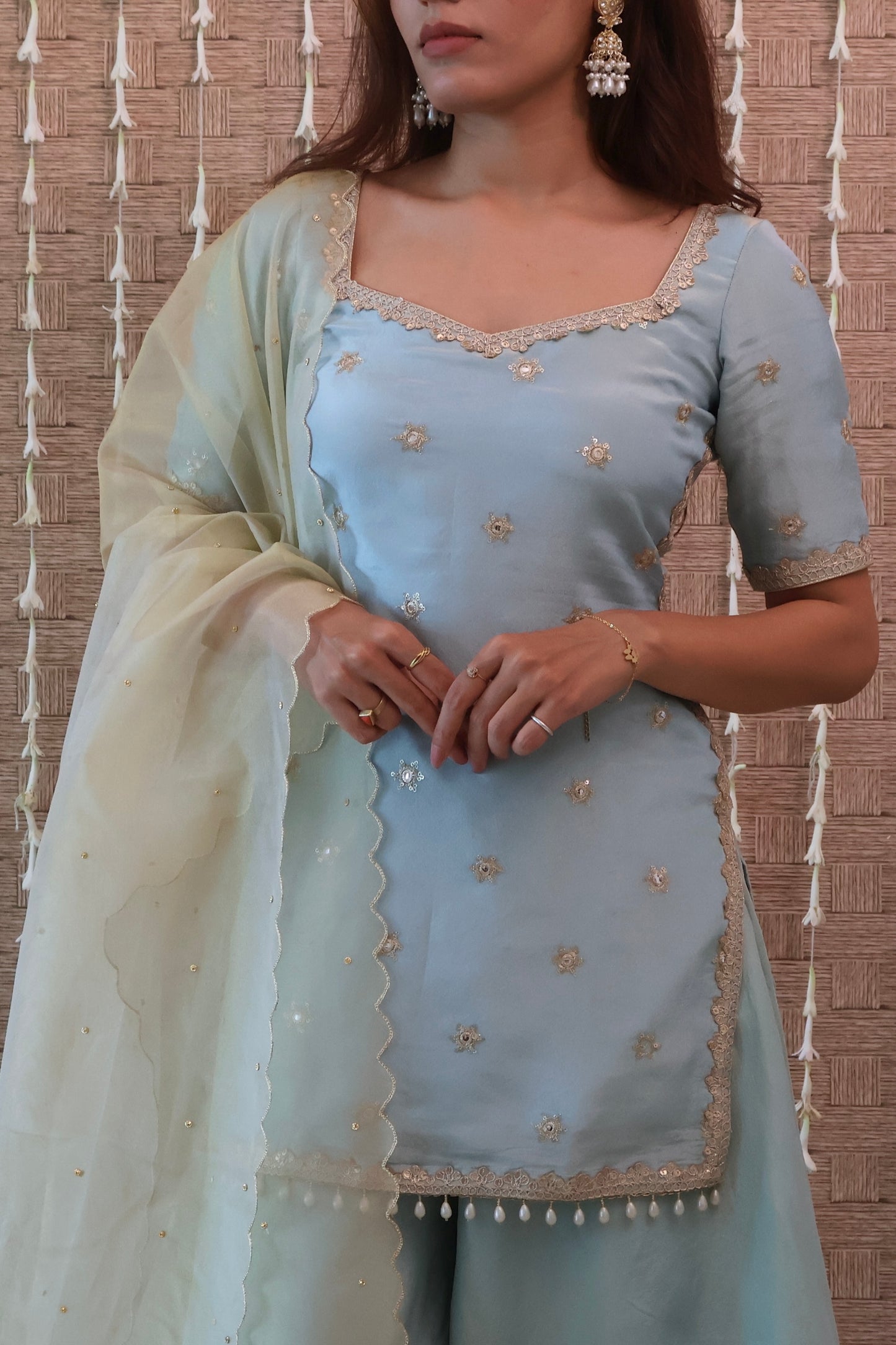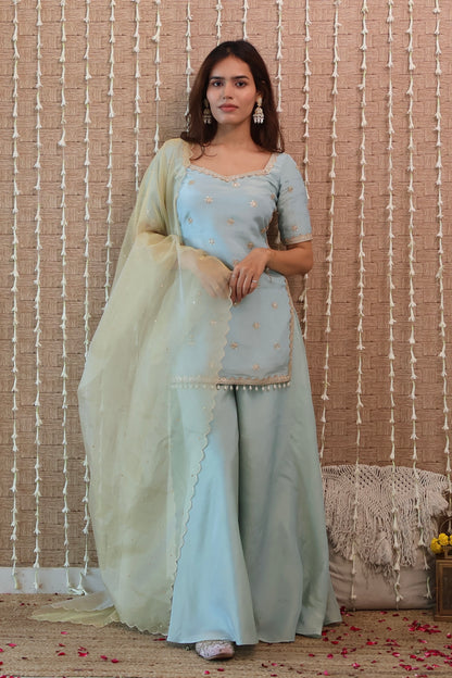 Powder Blue Embroidered Sharara Set with Organza Dupatta
